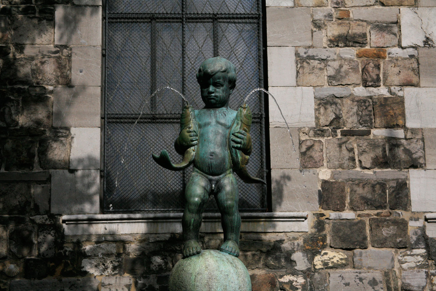 news121-38Um die Ecke ist der Fischmarkt, er zeigt das Fischpueddelchen. Dieses Fischpueddelchen ist ein urspruenglich 1911 errichtetes Brunnendenkmal Hugo Lederers vor dem Baptisteririum des Aachener Doms am Fischmarkt. Es zeigt einen puttenhaften, unbekleideten Jungen, der in jeder Hand einen grossen lebenden Fisch haelt.  Sein Gesichtsausdruck wirkt angestrengt, als konzentriere er sich ganz darauf, die Fische nicht zu verlieren. Hinter dieser Figur ist eine Jakobsmuschel an der Wand der Taufkapelle des Aachener Domes. Die Jakobspilger aus Aachen starten noch heute am Fischmarkt.