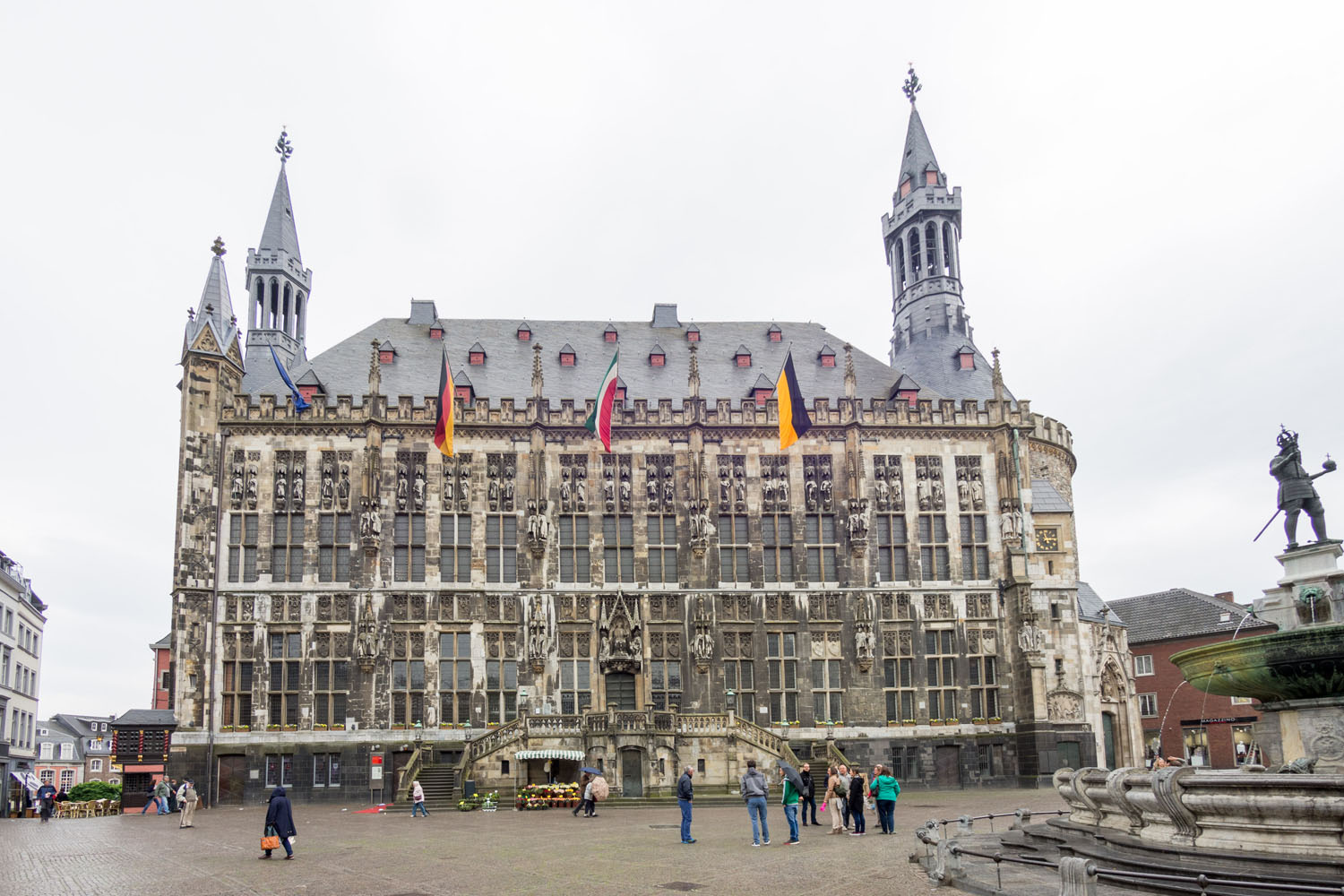 Aus dem Katschhof kann man den Aachener Dom, UNESCO Welterbe und das Rathaus sehen. Der Aachener Dom wurde als Stiftskirche St. Marien zu Aachen ab 793 erbaut. Es ist die einzige dokumentierte Kirchengruendung von Kaiser Karl dem Grossen. Ab 814 wurde der heutige Dom seine Grabeskirche. Das gotische Aachener Rathaus ist neben dem Dom das markanteste Bauwerk im historischen Stadtkern der Stadt Aachen.
