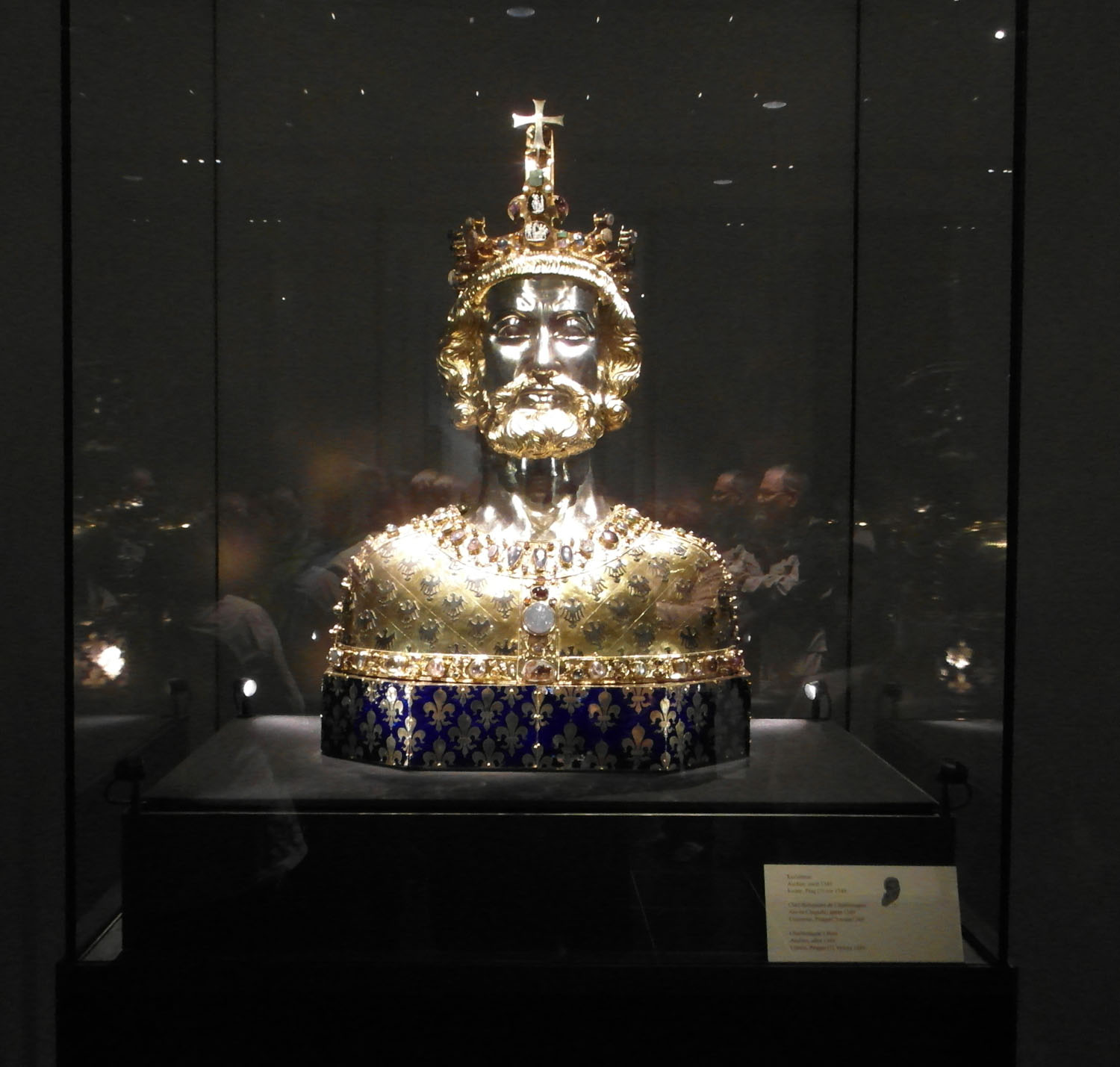 Karl der Grosse, Koenig des Fraenkischen Reichs (768-814) erhob Aachen - damals Mittelpunkt des Fraenkischen Reichs - i.J. 769 zur Pfalz. Seine Machtsphaere erstreckte sich ueber das heutige Frankreich, die Benelux-Staaten, Deutschland, Oesterreich und Norditalien. Er war nicht nur politisch und militaerisch interessiert, sondern foerderte auch Handel und Kultur. Die Rechtschreibung, wie Klein- und Grossschreibung, die Punkt- und Kommaregelung wurde zu seiner Zeit vereinheitlicht. Seine koerperliche Statur war passend zu seinem Namen.