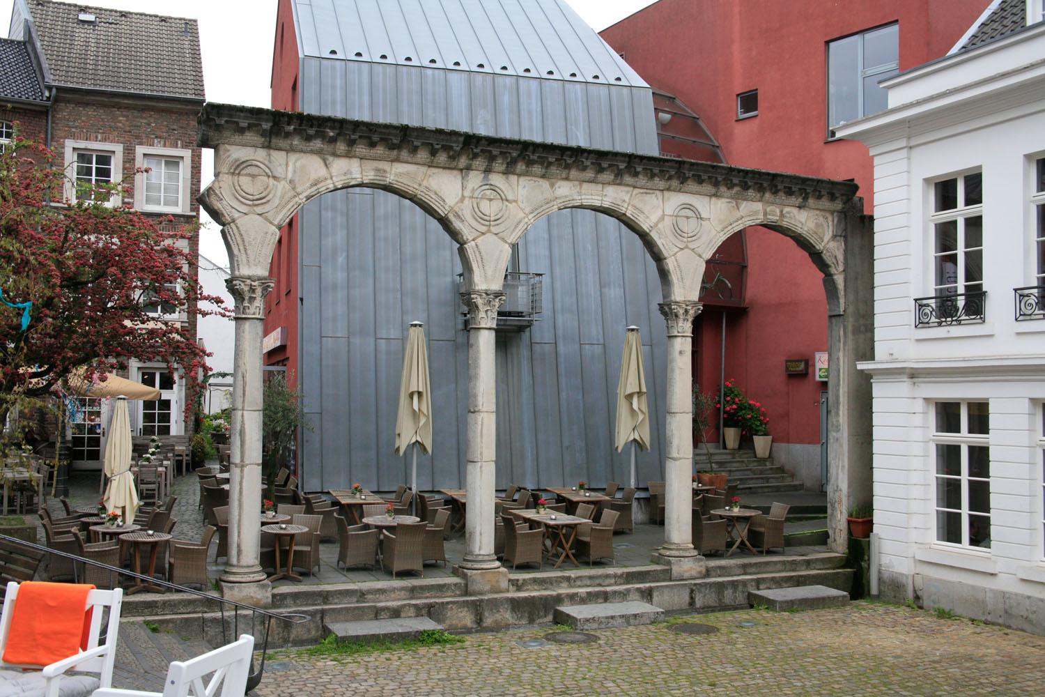 Treffpunkt war der Elisenbrunnen, der besteht heute aus einer offenen Wandelhalle mit dorischem Saeulenvorbau und jeweils einem Pavillon links und rechts mit mehreren Raeumlichkeiten. Aus zwei Trinkbrunnen fliesst das warme Wasser der Kaiserquelle (52 °C), das ueber eine Leitung vom Buechel zum Brunnen geleitet wird. Das Wasser ist stark schwefelhaltig, so dass vom Elisenbrunnen stets ein charakteristischer Geruch nach faulen Eiern (Schwefelwasserstoff) ausgeht. Zu Fuss marschierten wir zur Rueckseite zur Archaeologischen Vitrine. In der archaeologischen Vitrine werden Fundamente ausgestellt, die die Aachener Fruehgeschichte von der Jungsteinzeit bis ins spaete Mittelalter hinein anschaulich machen.