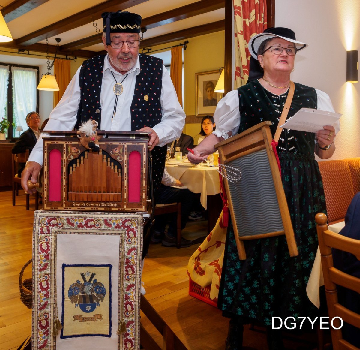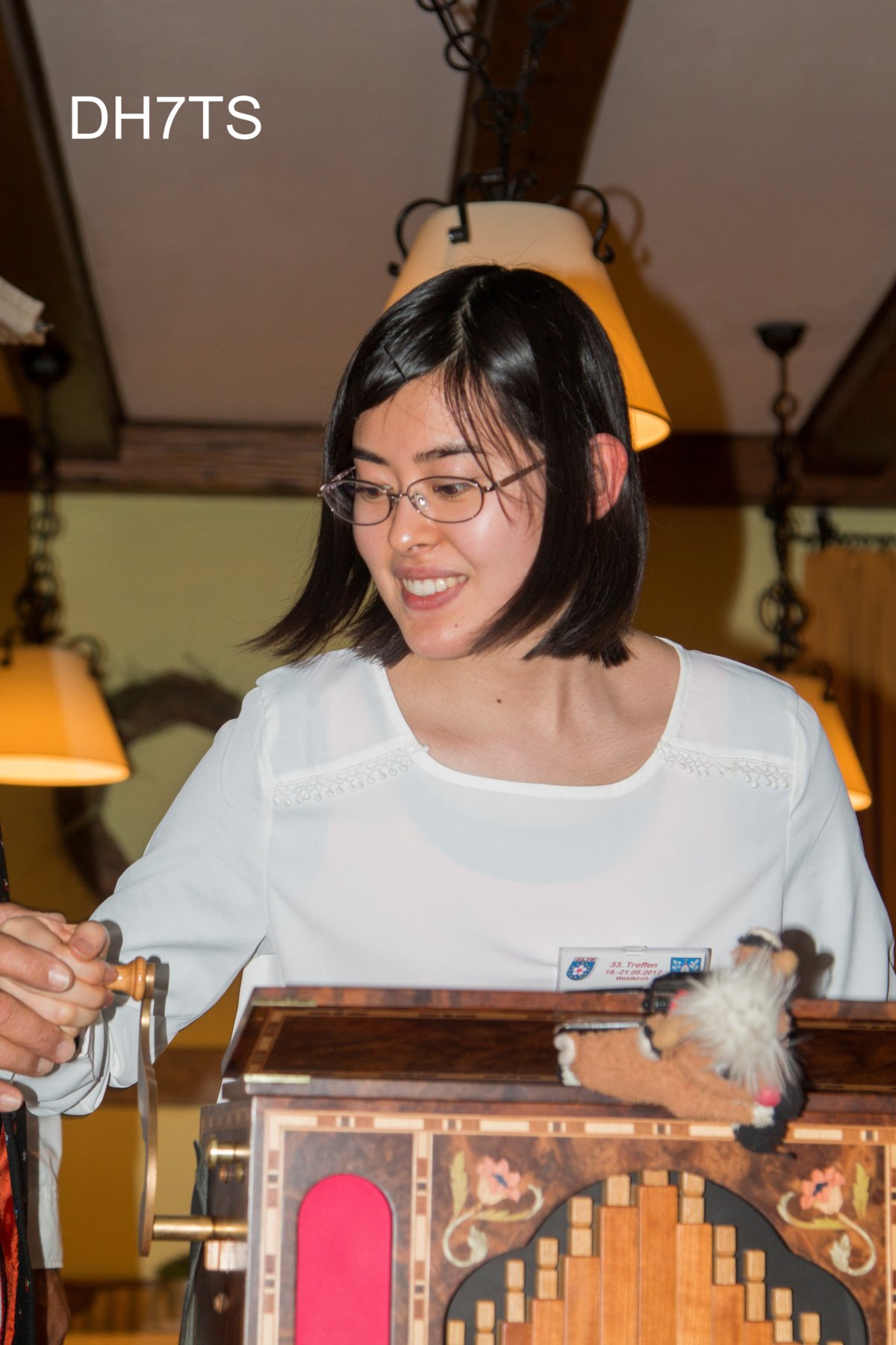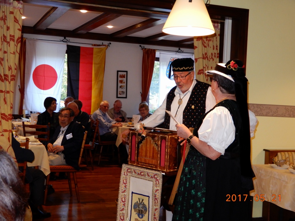 Nach der Vorspeise holten wir dann das Drehorgel-Duo Marita und Erich Cordes in den Saal. Die Ueberraschung ist uns gelungen und die Beiden sorgten fuer gute Unterhaltung und viel Spass. Fuer unsere japanischen Freunde war es ein besonderes Erlebnis, das war etwas voellig Neues fuer sie. Auch das „Innenleben“ der Drehorgel war recht inter­essant und wurde bereitwillig erklaert. Natuerlich wollten dann auch einige Freunde die „Kurbel drehen“ und mussten dabei feststellen, dass dies gar nicht so einfach war!