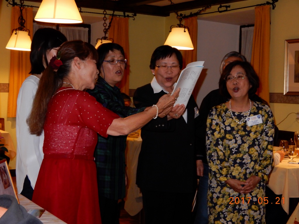 Bei dem gemeinsamen Abendessen spielte ein Kuenstler-Ehepaar eine Dreh-Orgel und sangen die japanischen Damen im Chor. Es war ein sehr froehlicher Abend.