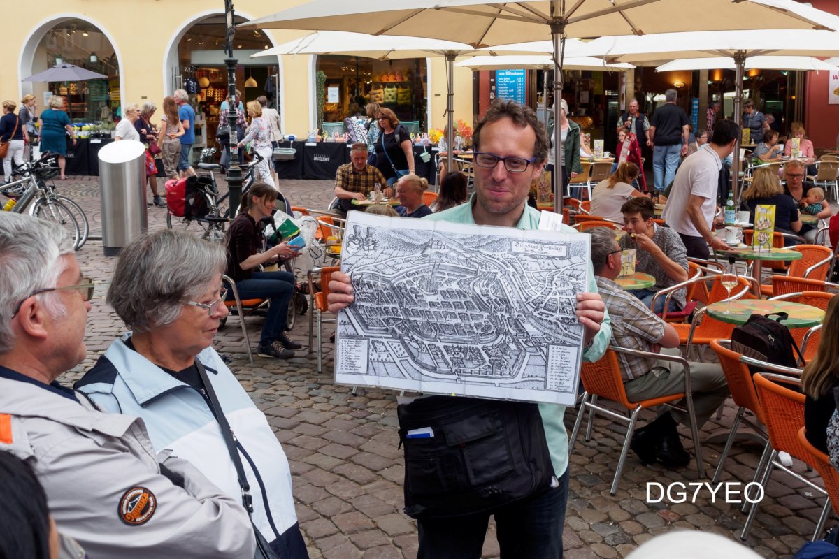 Wir sind an der Strassenbahn entlang zum Martinstor links quer zum historischen Kauf­haus – dank dem Baechlewasser ist es erhalten geblieben – zum Wahrzeichen Freiburgs, das Muenster gegangen. Am Markt auf dem Muensterplatz haben wir eine Kleinigkeit gegessen und gestaerkt um die Ecke als Nachtisch italienisches Eis gegessen. Langsam gingen wir zum Treffpunkt am Rathausplatz zurueck und warteten auf den offiziellen Touranfang. Eckardt blieb allein am Rathausplatz.