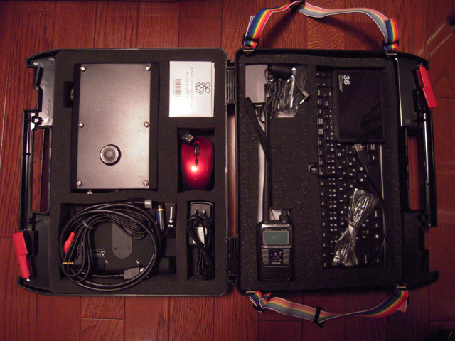 私の場合、D-STARを運用する時はアタッシュケースからDV-MEGA本体とハンディ機を取り出してから始めます。DV-MEGAはRaspberryに実装しています。このアタッシュケースには、キーボード/マウス、モニタ、ケーブル一式を収納していますので、Raspberryをメンテナンスすることができます。
