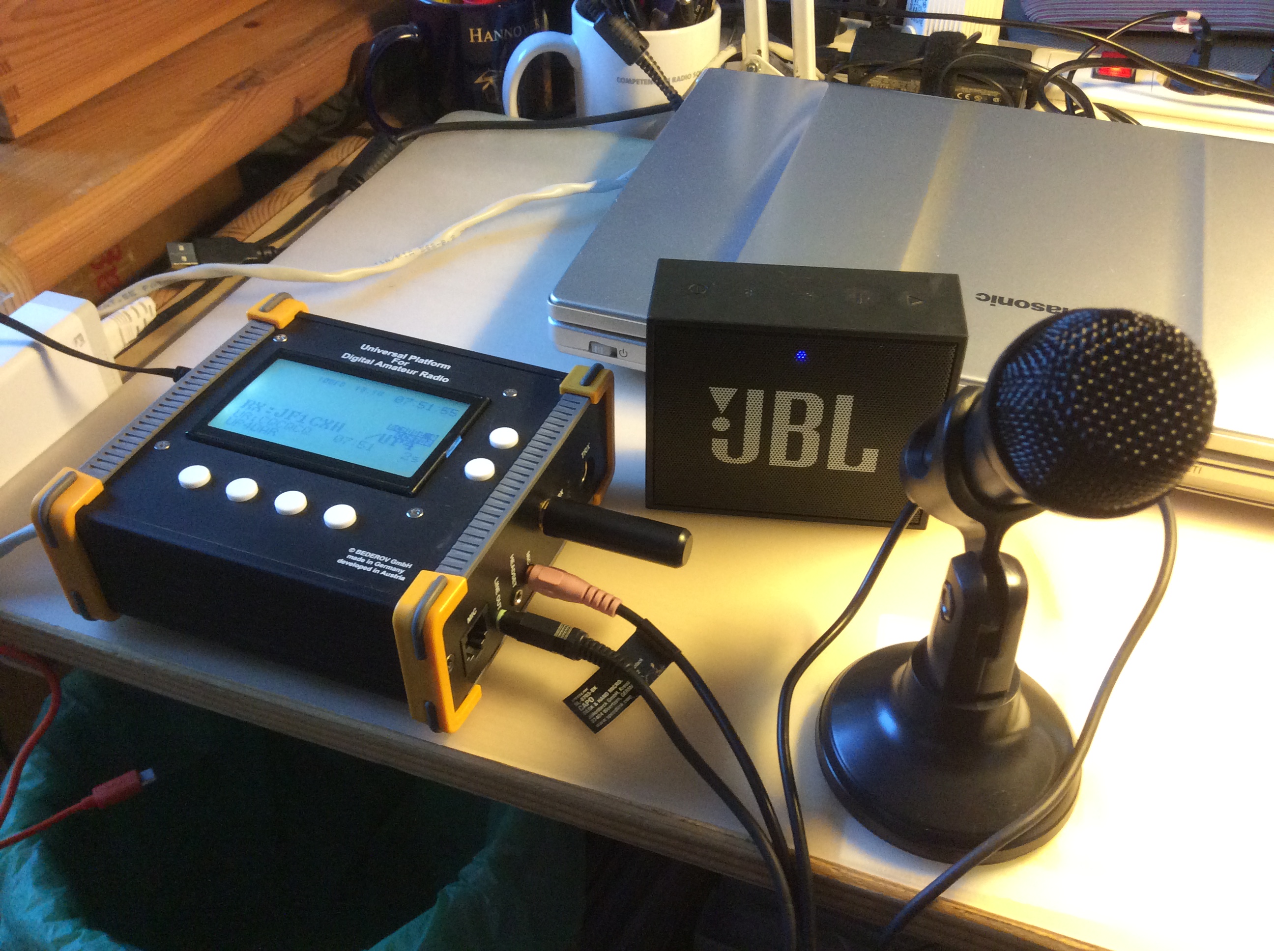 Foto li. Ich benutze fuer die D-Star QSO einen PC oder ein Smartphone, dazu einen AMBE Server und einen JBL Lautsprecher. Zu Hause kombiniere ich PC und AMBE Server. Wenn ich mobilerweise QSO betreibe, dann Smartphone und AMBE Server. Als ich vom Matterhorn QRV war, hatte ich mit dieser Kombination Verbindung mit DF2CW und JA1DKN. Foto re. zeigt den AMBE Server und PC. (ges. Shack Ansicht)