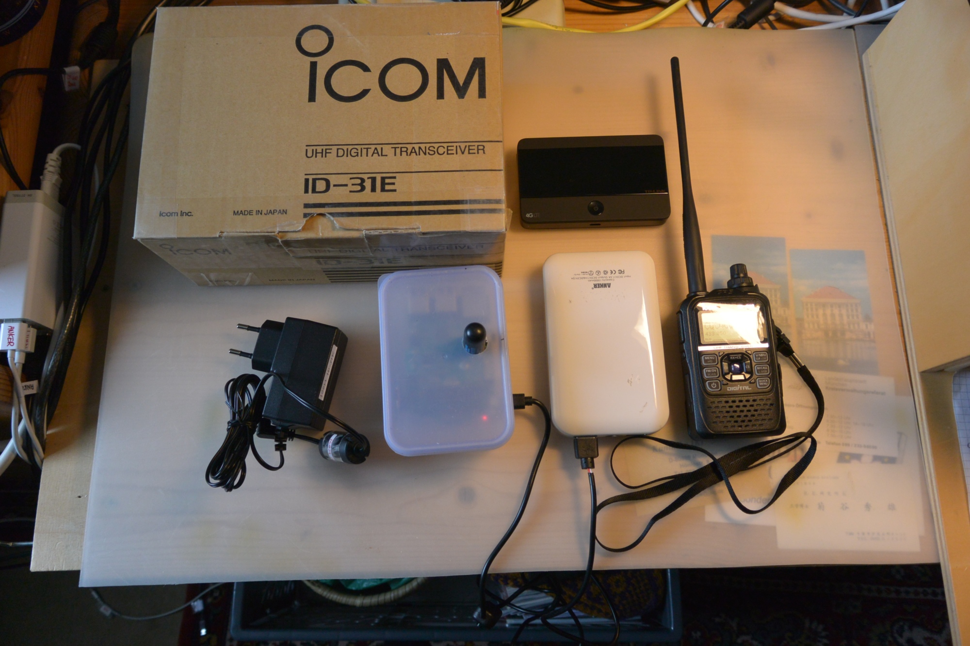 Die unterstehenden Elemente sind mein D-Star mobil-Set. Es besteht aus DV MEGA mit RaspberryPi, der Mobil-Router ist ein TP-LINK und Funkgeraet ein ID-31, sowie eine Lithiumbatterie. Naeheres habe ich im Maerz 2018 im internet portal „QTC-Japan“ veroeffentlicht.