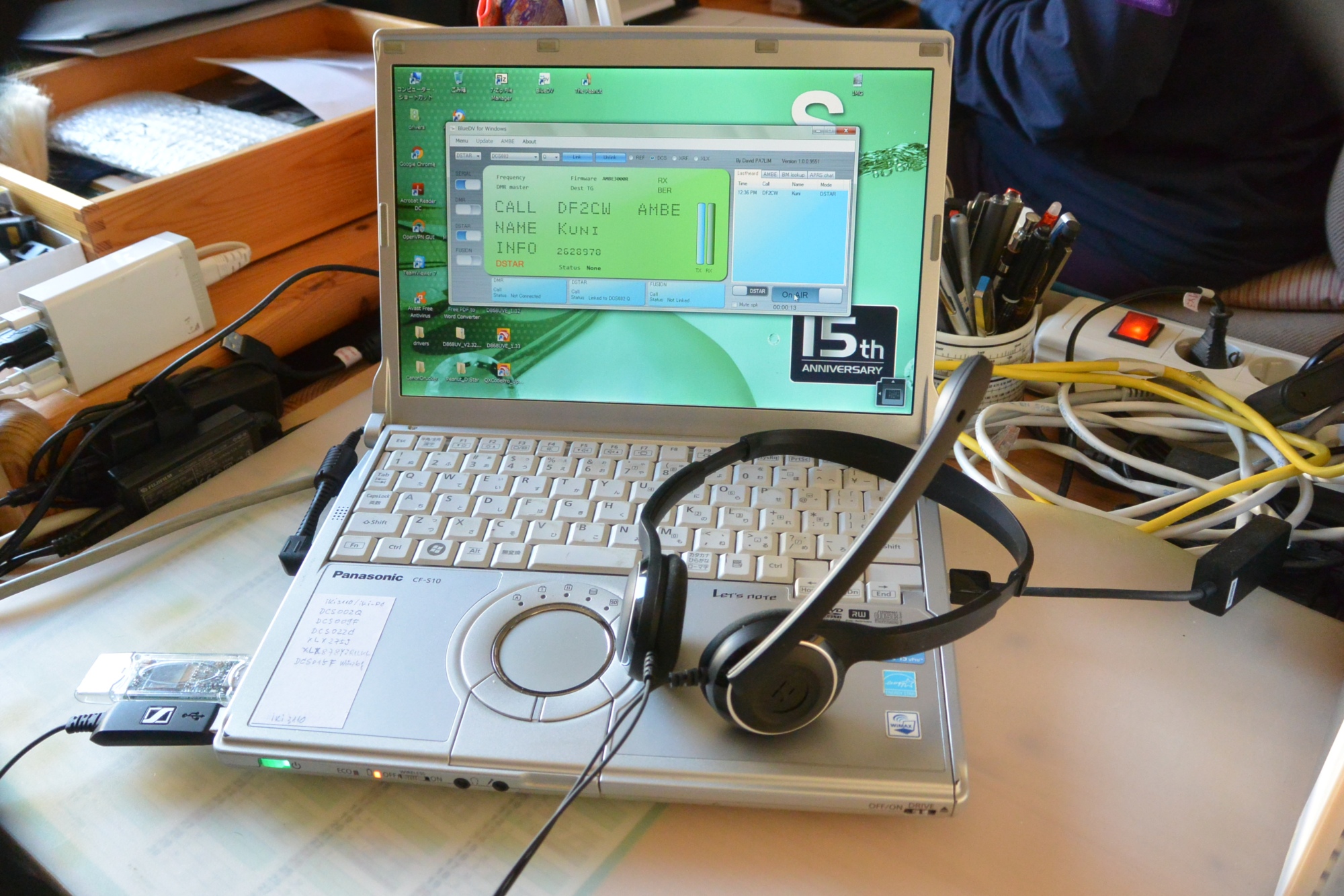 Dieser Aufbau ist eine Kombination aus DV-Stick30 und Note Book PC. Sie wird von JA1IFB, DJØ0OQ, K4ST, JA1OGX und auch noch anderen OM‘s verwendet. Dieses System hat kein Funksignal, daher ist nach jap Funkgesetz kein Aenderungsantrag notwendig. Daher kann, wer eine allgem. Funklizenz besitzt, sofort mit D-Star QSO anfangen. Wie untenstehendes Foto zeigt, benutze ich einen Kopfhoerer mit integr. Mikrofon. Waehrend der QSO kann ich mit einem anderem PC weiterarbeiten. Ich glaube, es wird in Zukunft der meist verwendete Style.