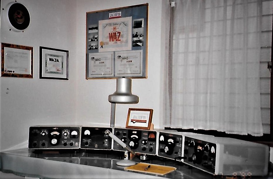 In August 1974 Hiro acquired the used Collins S-Line at Associate Radio managed by W0BC in Kansas City, Missouri. That is the wing-emblem the Collins S-Line consisting of a 312B-4 station console, 32S-1 transmitter and 75S-1 receiver. Following is a picture of them took after the inspection with the Kanto Bureau of Telecommunications.