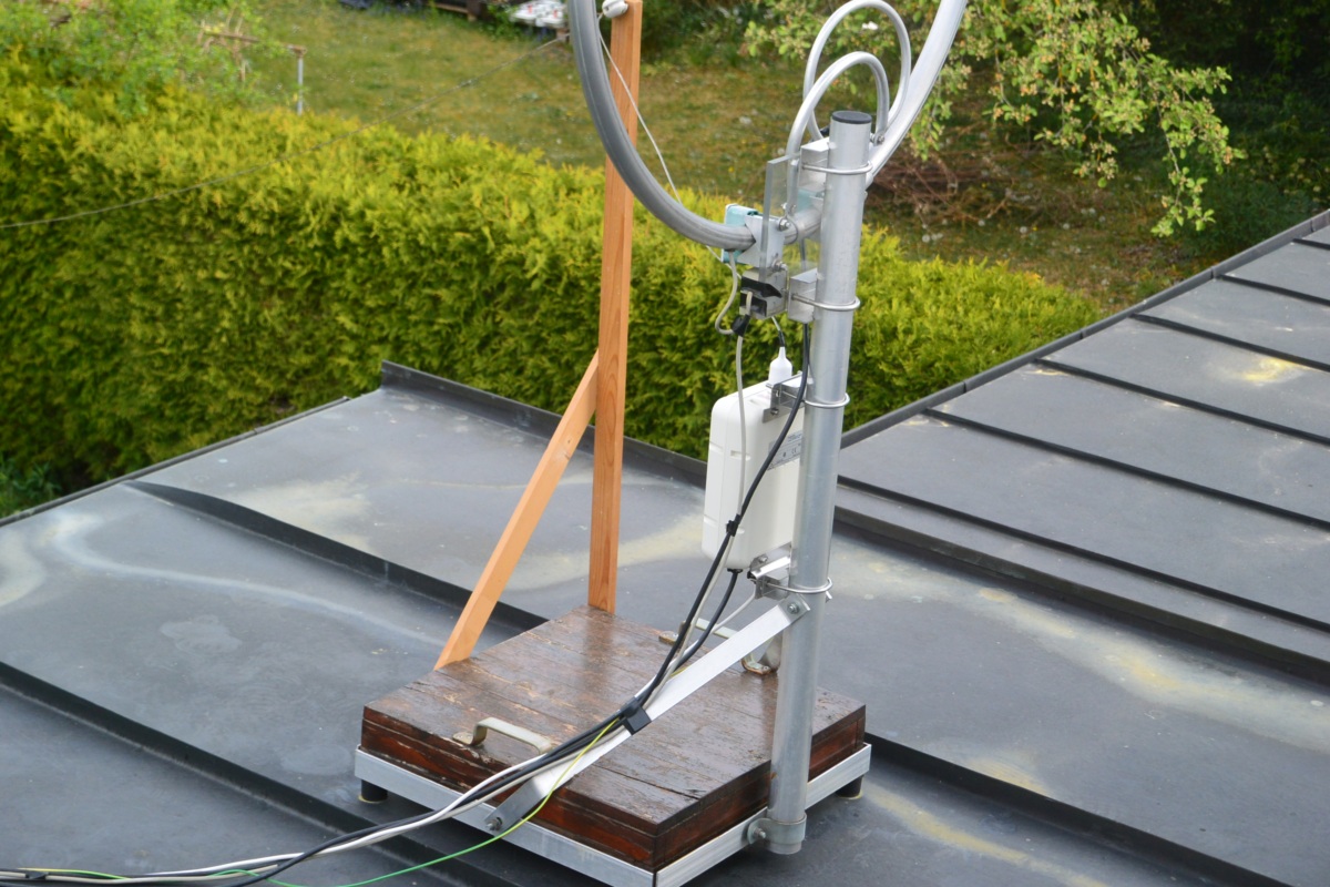 Also habe ich beschlossen, die AH-4 am Mastteil des Staenders zu befestigen, an dem die Magnetische Loop-Antenne angebracht ist. Der Stand enthaelt einen ca. 50 cm² grossen Strassenpflasterstein als Gewicht. Dieses Gewicht reicht aus, um die Drahtantenne zu halten. Dann wurde eine vertikale Stange angebracht, um den Einspeisepunkt zu entlasten und der eifoermige Isolator wurde angeschraubt. Die Antennenspitze ist auf der anderen Seite der Elemente an einem Glasfasermast (der von DK9SQ entwickelt und hergestellt wurde) angebracht. ![]()