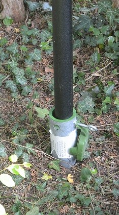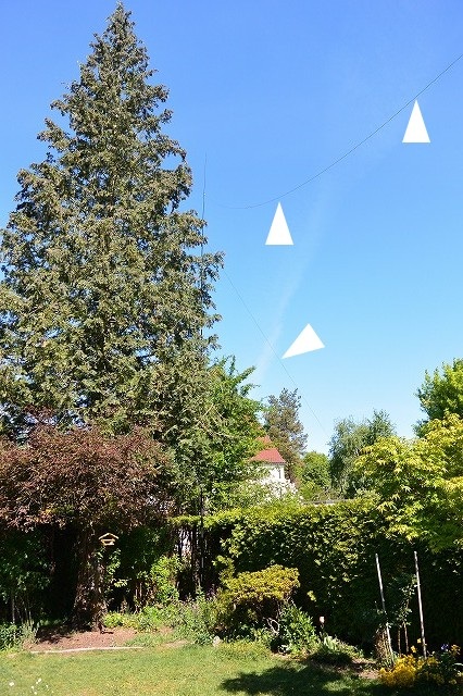 Den Mast hatte ich zuvor fuer den Mobilbetrieb vorgesehen. Er wird mit drei Kunststoffseilen festgehalten. Fuer den Glasfasermast wurde ein unterirdischer Montagestaender (sh. Foto li) verwendet. Der Antennendraht wird in einer Hoehe von ca. 10 m ueber dem Boden gespannt (sh. Foto re).
