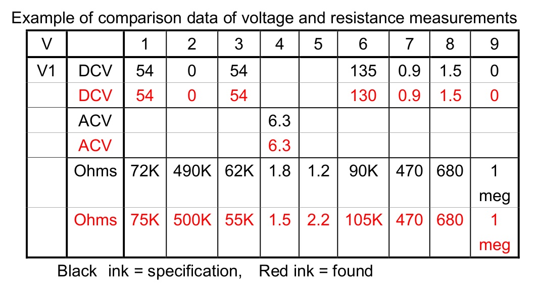 Example of comparison data of voltage and resistance measurements